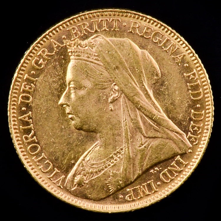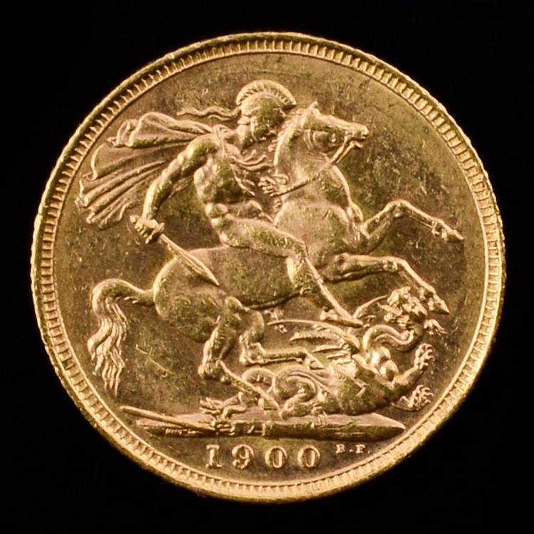 Este soberano da Rainha Vitória (a cabeça velha também conhecida por cabeça velada ou viuva) com o design de Thomas Brock, tem no reverso a gravura de São Jorge e o Dragão de Benedetto Pistrucci.